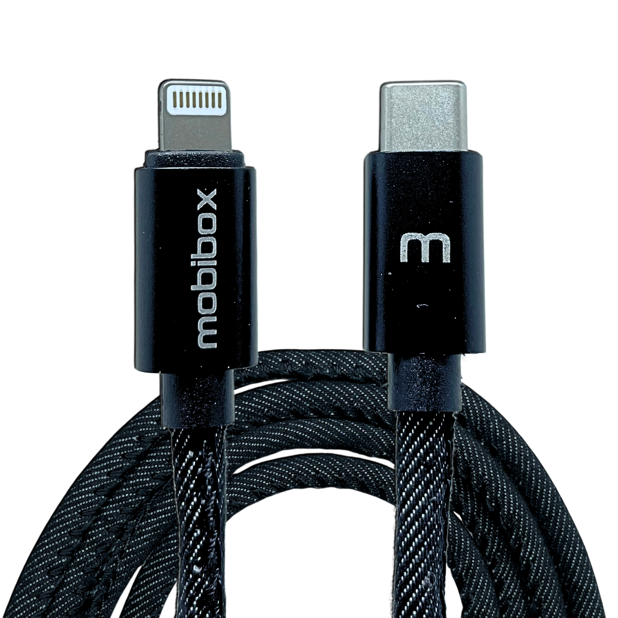 Cabo com acabamento em tecido jeans - mais resistente, flexível e não enrola facilmente.